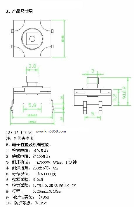 防水輕觸開關KM1212插腳